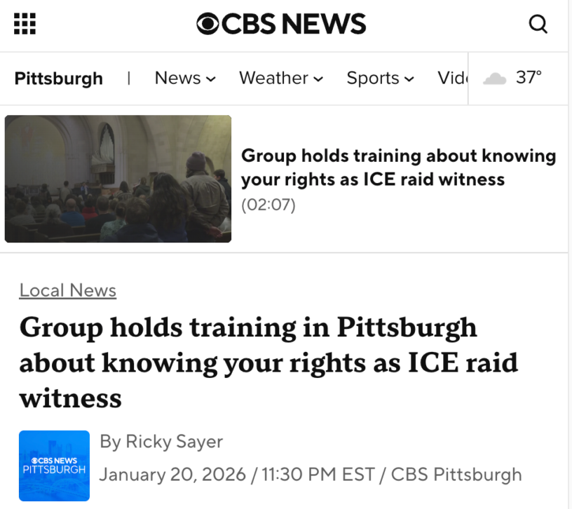Frontline Dignity is featured on CBS Pittsburgh in the article, Group holds training in Pittsburgh about knowing your rights as ICE raid witness. From the article: